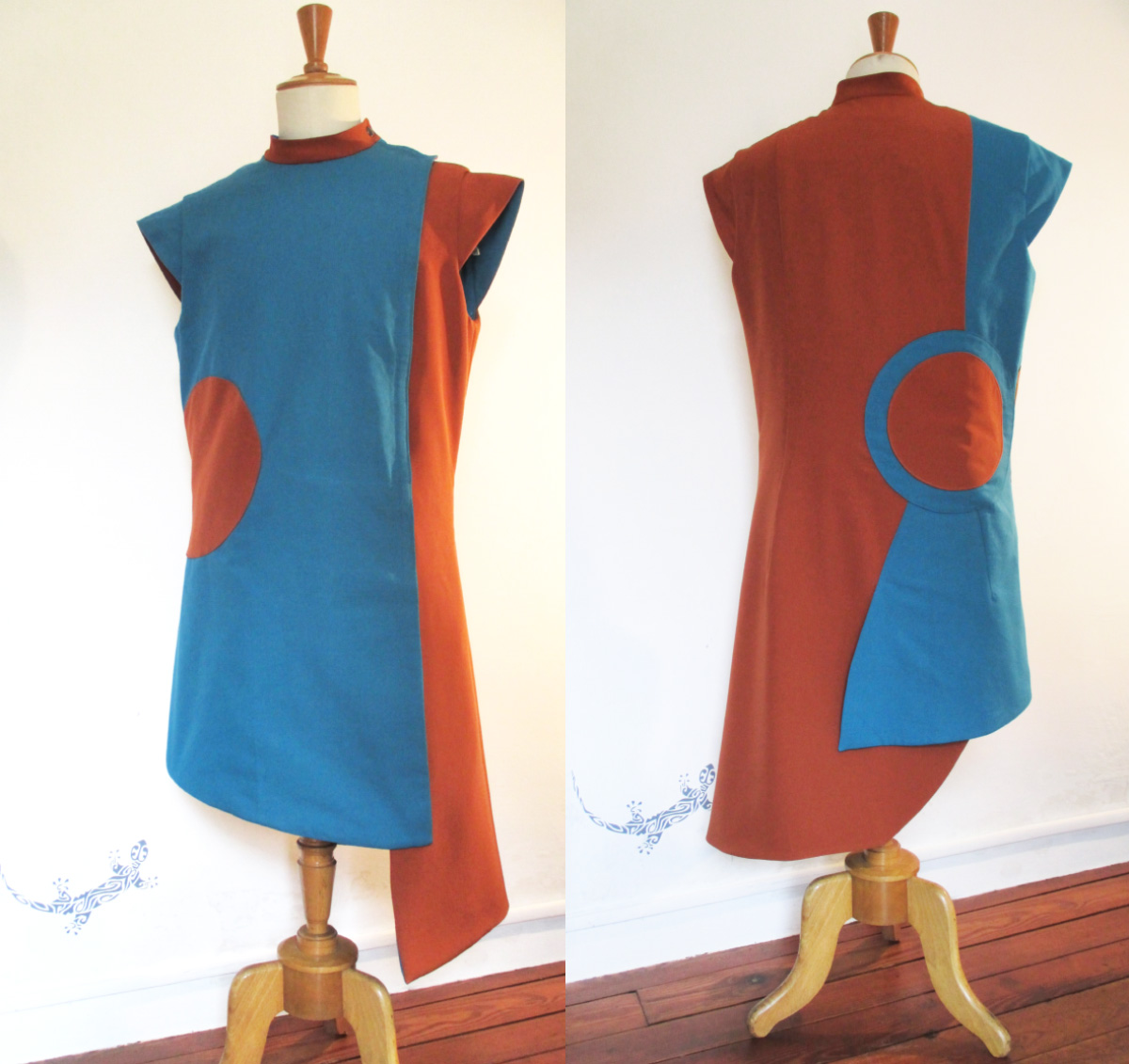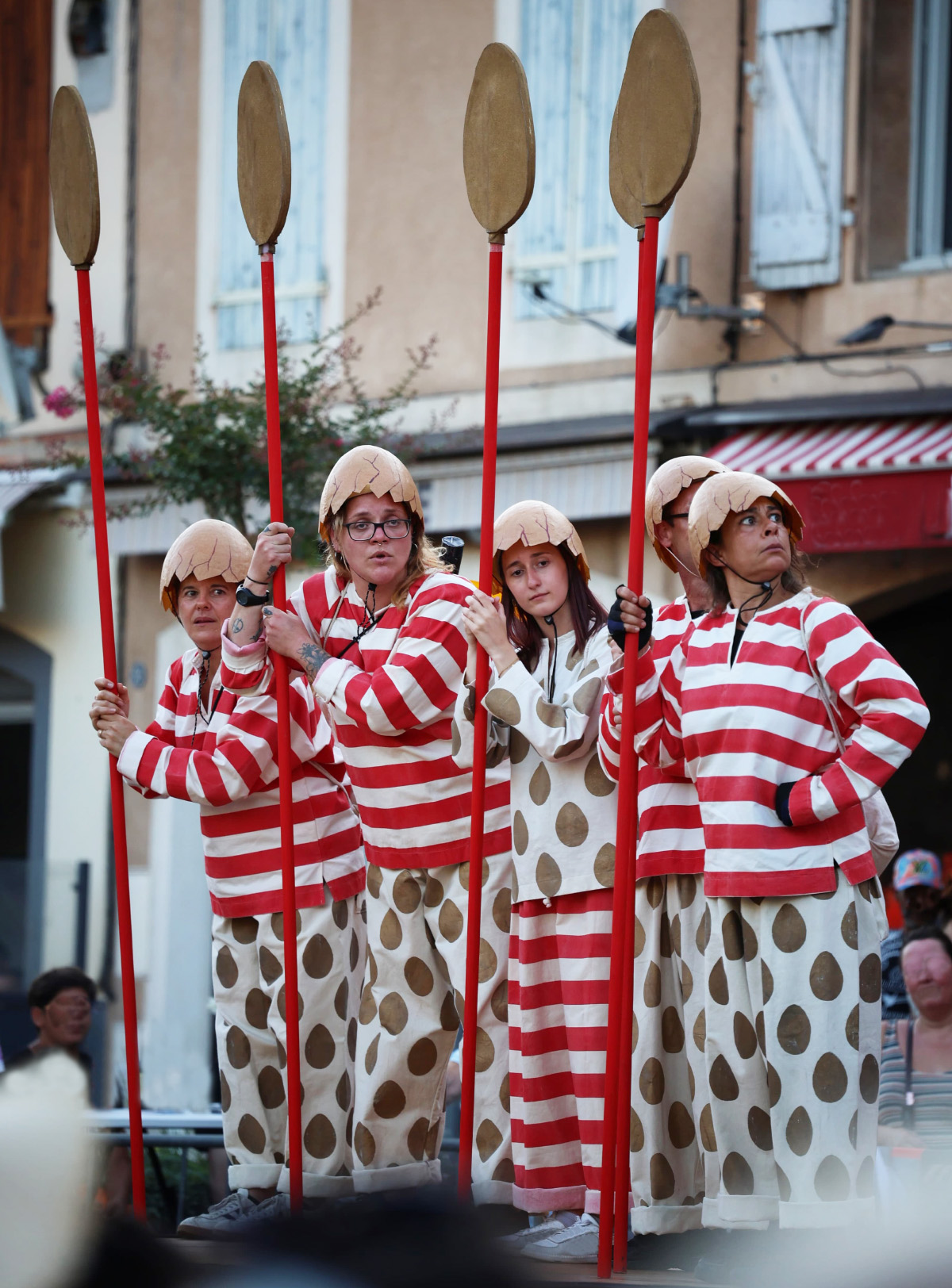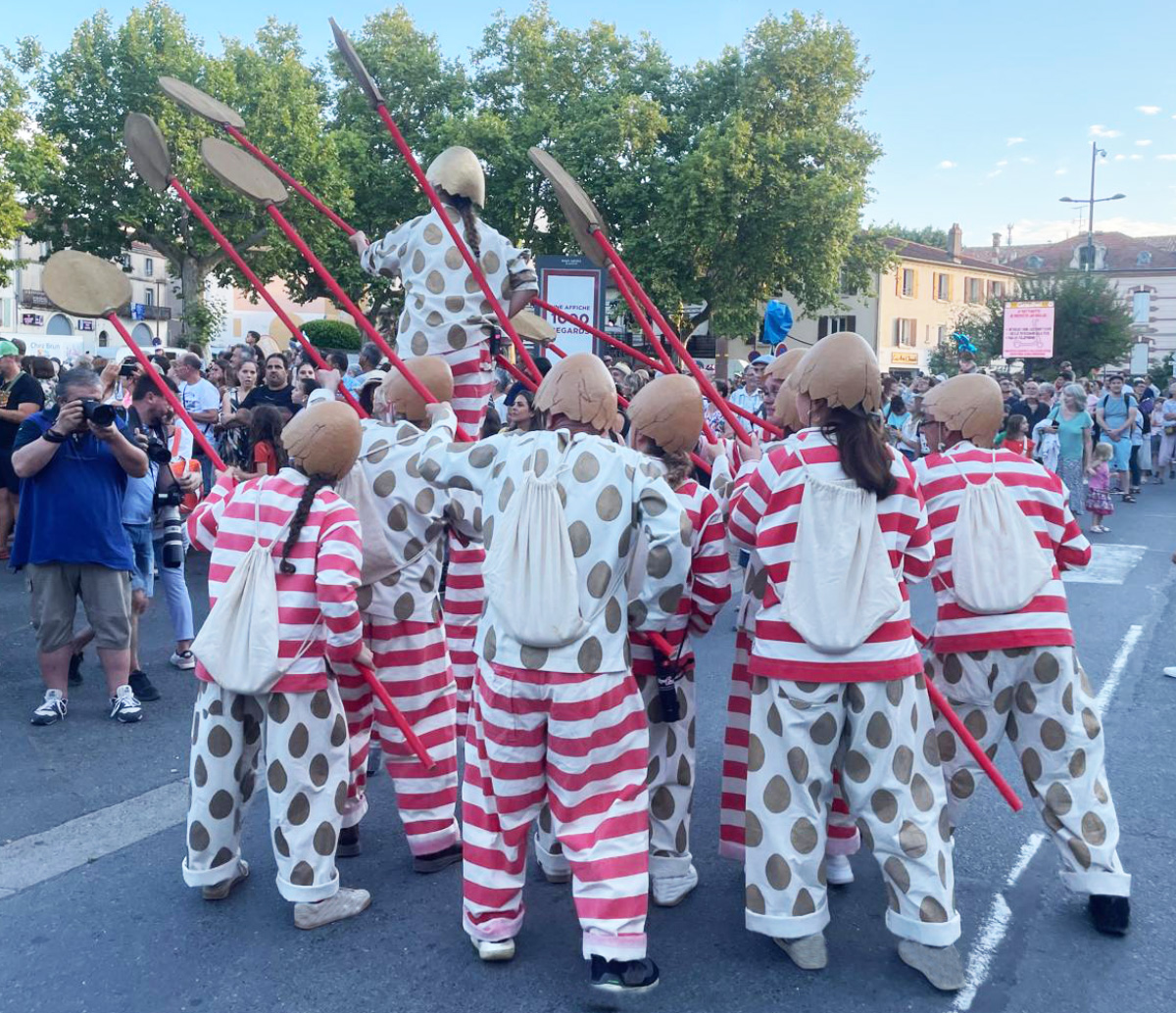 Réalisés par l’équipe couture de la Cie Plasticiens Volants, costumes peints par le peintre, patronnés par moi et cousus par l’équipe couture.